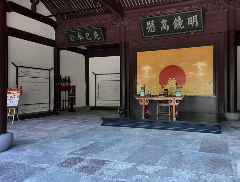 在户房展陈的慈城清风图卷四季交替,1000多个人物穿梭其中,与县域治理、民间习俗、传统节日的16个场景,共同描慕出慈城的清明上河图。大堂的一联三區四碑、清风华裳的31个AI复古场景、422位历代县官、87位名宦、10位慈城籍御史、清官百家谱,共同组成了清风园中轴线。