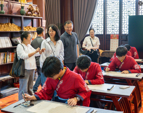 团扇素净如月,DIY时,大家选好颜色滴入染缸。靛蓝漫过扇面似流水,绯红晕开若晚霞,染出的每一抹色,都像从《大学》“格物致知”或范蠡“诚信为本”里采来的光。团扇轻摇,风里都是手作的温度。