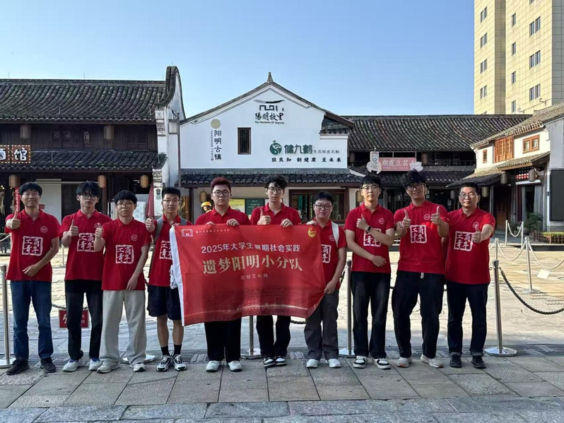 小分队在古镇广场集合合影。古街建筑与现代路灯在暮霞中交融,队员们手持“遗梦阳明” 旗帜,汗水未干的脸上洋溢着收获。带队老师总结:“从石坊历史到展馆科技,我们用一天时间串联起阳明文化的‘过去 - 现在 - 未来’。” 快门声响,夕阳为石板路镀上金边,实践成果随合影定格 —— 既是对 “知行合一” 的践行,也为后续文化传播积累了丰富素材。
