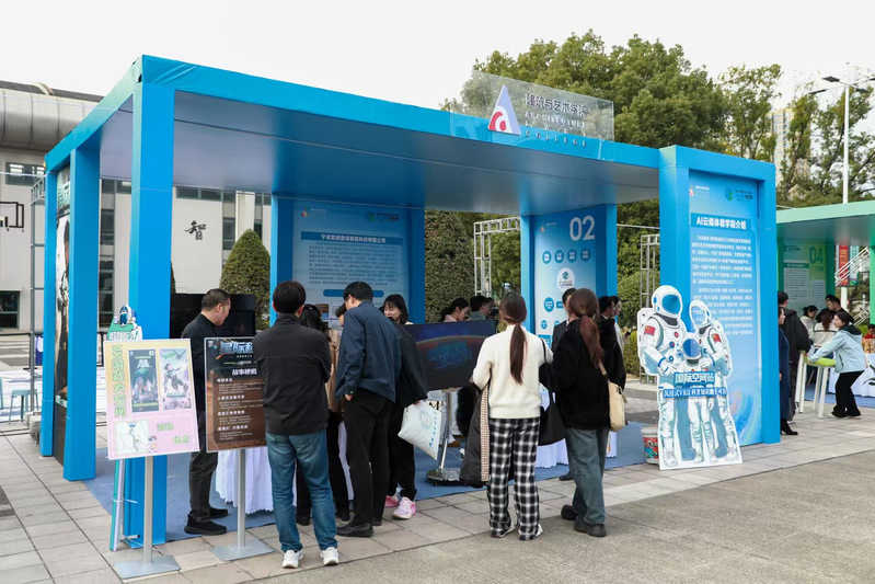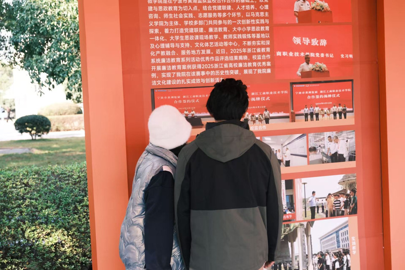 谢国希作为企业代表讲话。他指出中国农业银行宁波市分行持续以多种形式支持学校的科技文化节与商品展销会,也积极助力学校在产教融合、实践育人方面的探索。他强调每一件作品、每一次交易,都是一次“价值”的启蒙,也是一份“信用”的积淀,要守护这份宝贵的初探,助力创意走得更稳、更远。他希望依托金融服务网络与资源,为学校育人实践、产教协同以及学子的成长发展,提供持续、温暖的支持。