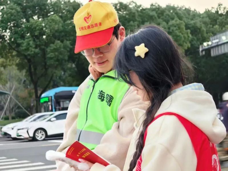 路口处,荧光绿(文明交通志愿马甲)与红马甲(反邪宣传小队)交叠成“安全光谱”。反邪读本在交通岗旁化作“守护暗号”,文明交通志愿力量与反邪小队双向奔赴,把法治防线从社区院落织进车水马龙里,让每段街巷都成“平安结界”。