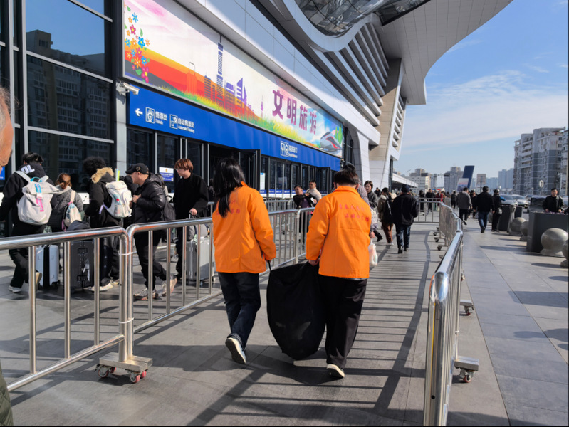 在春运的旅途中,我校学子们用行动温暖着每一位归家的旅客。在火车站,他们身着橙色志愿者服装,化身“小桔子”,热情地为旅客指引方向,耐心解答各种问题。