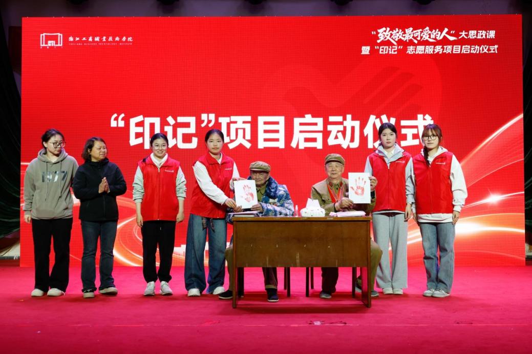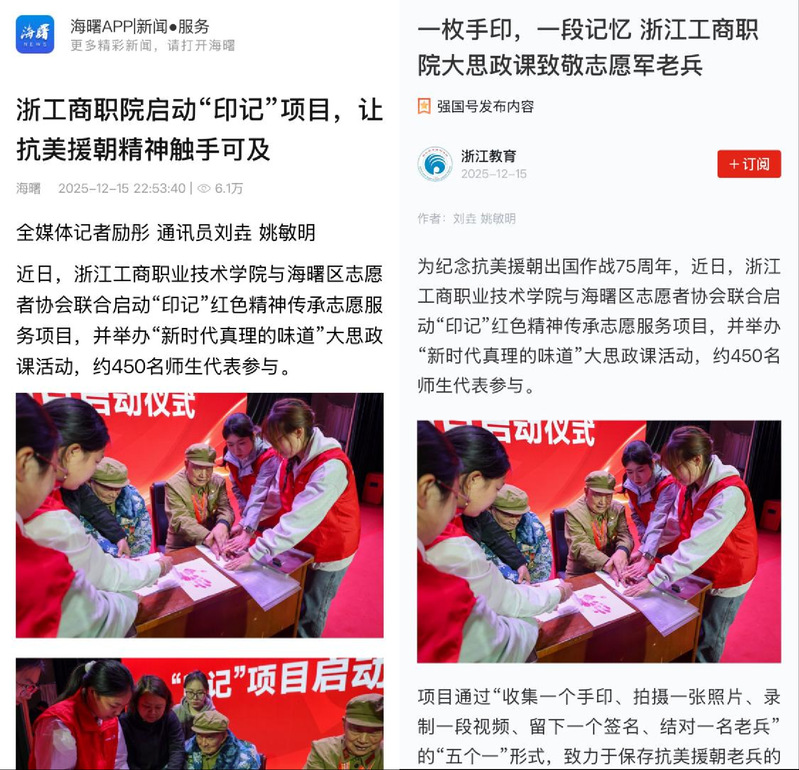 浙江工商职业技术学院“印记”志愿服务团队,铭记伟大抗美援朝精神,聚焦新时代爱国主义教育和红色文化传承,依托校地协同与志愿服务平台,通过“手印印记+口述历史”的温情方式,致力于为健在的抗美援朝老兵留存珍贵历史记忆,构建起“追寻历史、致敬英雄、传承精神”的红色志愿服务新模式。