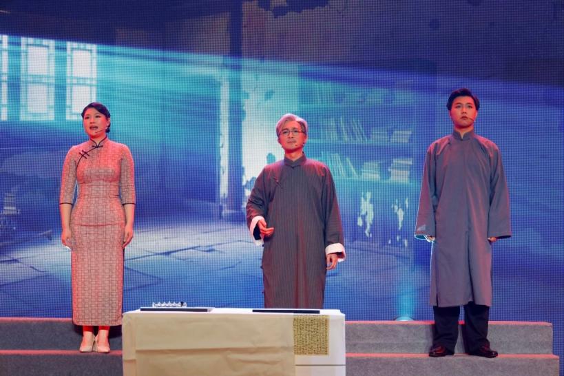 对话回溯迁徙办学缘起:此次演出的序幕部分,以1944年的宁海跃龙山校长办公室为场景,通过汪焕章校长与顾鄞洲、沈颖芗的对话,回溯了1941年宁波沦陷后,鄞县县立商业职业学校等三所学校合并组建鄞县县立临时联合中学并开启迁徙办学的历史背景,展现了先辈们守护教育火种的初心。