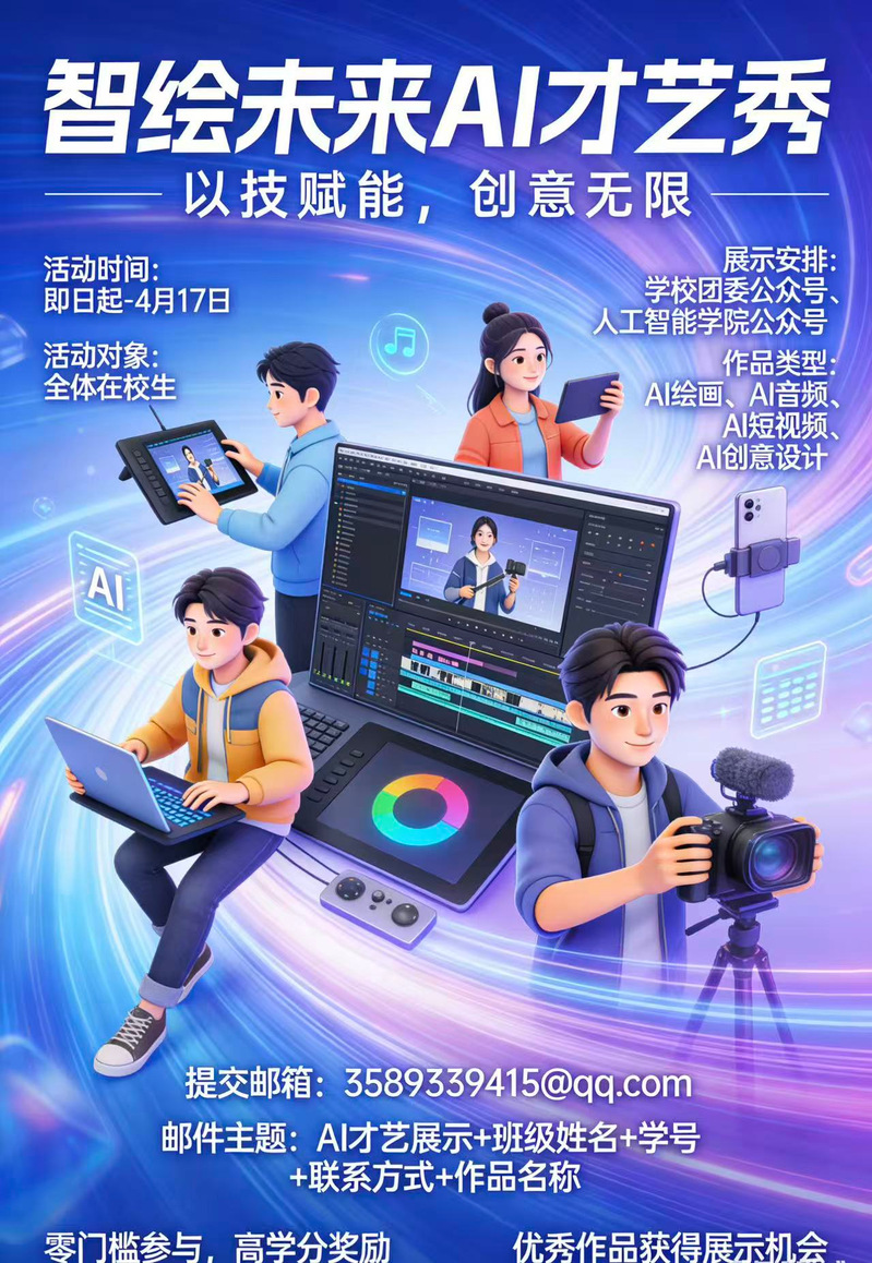 人工智能学院推出“智绘未来”AI才艺秀 邀你用AI解锁创作边界 在实践中锤炼专业本领 在展示中收获成长与认可 零门槛参与,高学分奖励 优秀作品更将获得全校范围的展示机会 ——这个舞台,正等你来!