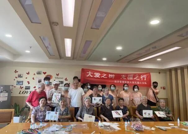“大爱无疆”小分队第二站走进福龄颐养院开展以“敬老学子心,爱老我之情”为主题的志愿服务活动,用实际行动为老人们送去关爱和温暖。到达颐养院之后,小队分为了两个小组——手工组、卫生组。在工作人员的带领下,两队工作都有条不紊的进行着。手工组的同学手把手的教老人们做手工,不仅锻炼了老人们的动手动脑能力,还能提高老人们的审美能力,陶冶情操。卫生组的队员们拿起扫帚、拖把、抹布等清洁工具,把颐养院的里里外外都打扫了一番。楼梯下、窗户缝等卫生死角都被清理的干干净净,队员们勤劳的身影成了颐养院一道亮丽的风景线,他们付出的努力得到了颐养院工作人员和老人的一片赞扬。