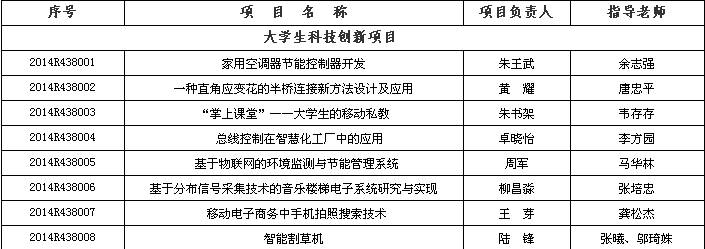 近日,根据《关于公布浙江工商职业技术学院2014年浙江省大学生科技创新活动计划(新苗人才计划)立项结果的通知》,我校由团委选送的“家用空调器节能控制器开发”科技创新项目等八项大学生科技创新项目获得浙江省大学生科技创新活动计划立项和资助。具体名单如下: